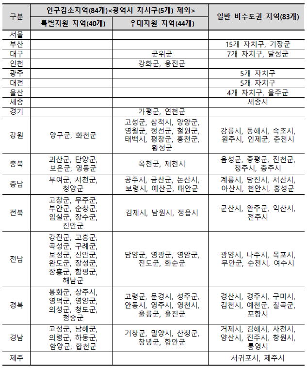 이 지역들은 수도권이지만 인구감소지역으로 분류되어 비수도권으로 취급됩니다.