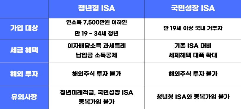 기존 ISA와 청년형 ISA, 국민성장 ISA 차이