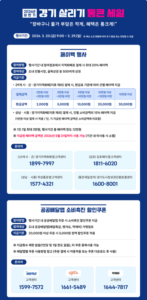 2026년 상반기, 경기도에서 최대 20% 페이백이라는 강력한 혜택을 내세운 ‘경기 살리기 통큰 세일’이 시작됐습니다!