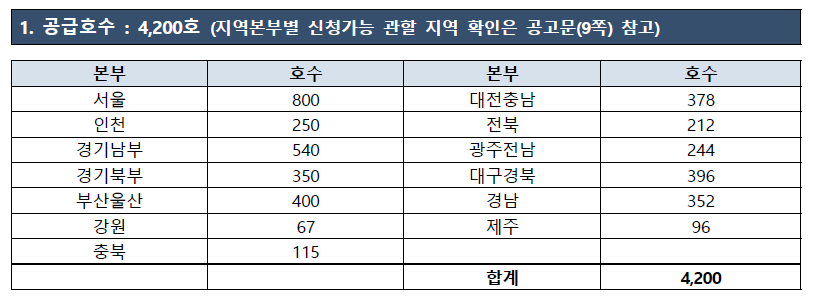 주택 공급호수는 총 4,200호이며, 지역 별로 해당 호수만큼 계약이 가능한 걸 확인하시길 바랍니다!