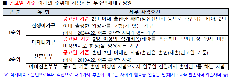 • 1순위: 신생아 가구 (최근 2년 이내 출산한 자녀 + 태아도 가능) & 다자녀 가구 (2명 이상의 자녀)