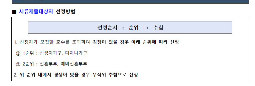 신청자가 모집할 호수를 초과하여 경쟁이 있으면 순위에 따라 선정하며, 이 순위 내에서 경쟁이 있으면 무작위 추첨으로 선정할 예정이라고 합니다!
