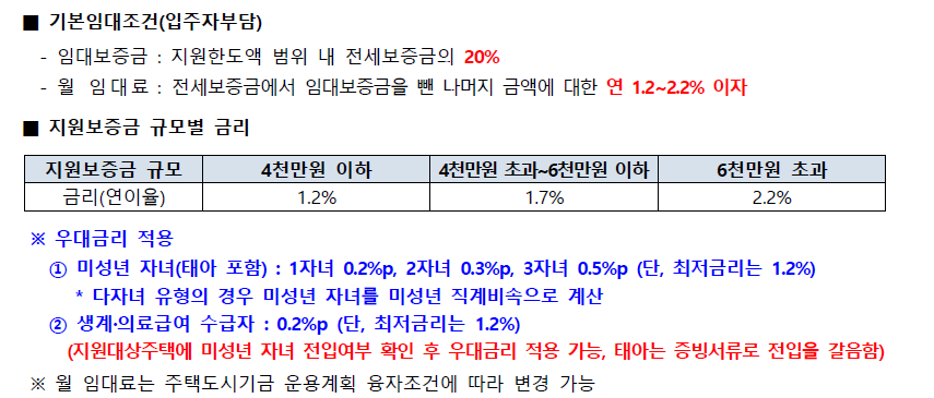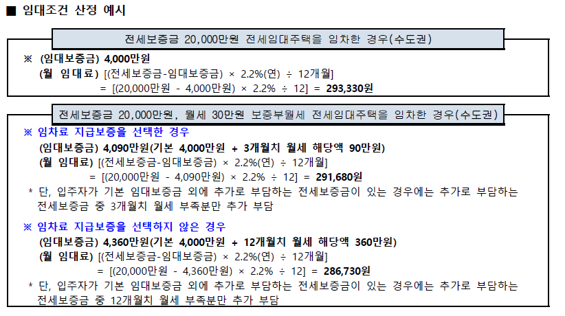 예를 들어, 보증금이 2억원인 수도권 주택에 거주할 예정이라면, 전세보증금의 80%인 1억 6천을 LH에서 지원하고, 입주자(신청자)는 나머지 20%인 4천만원을 부담하면 되는 겁니다! 추가로 LH에서 지원해 준 1억 6천을 연 1.2~2.2% 이자를 내며 월 임대료를 내는 구조인 셈이죠!